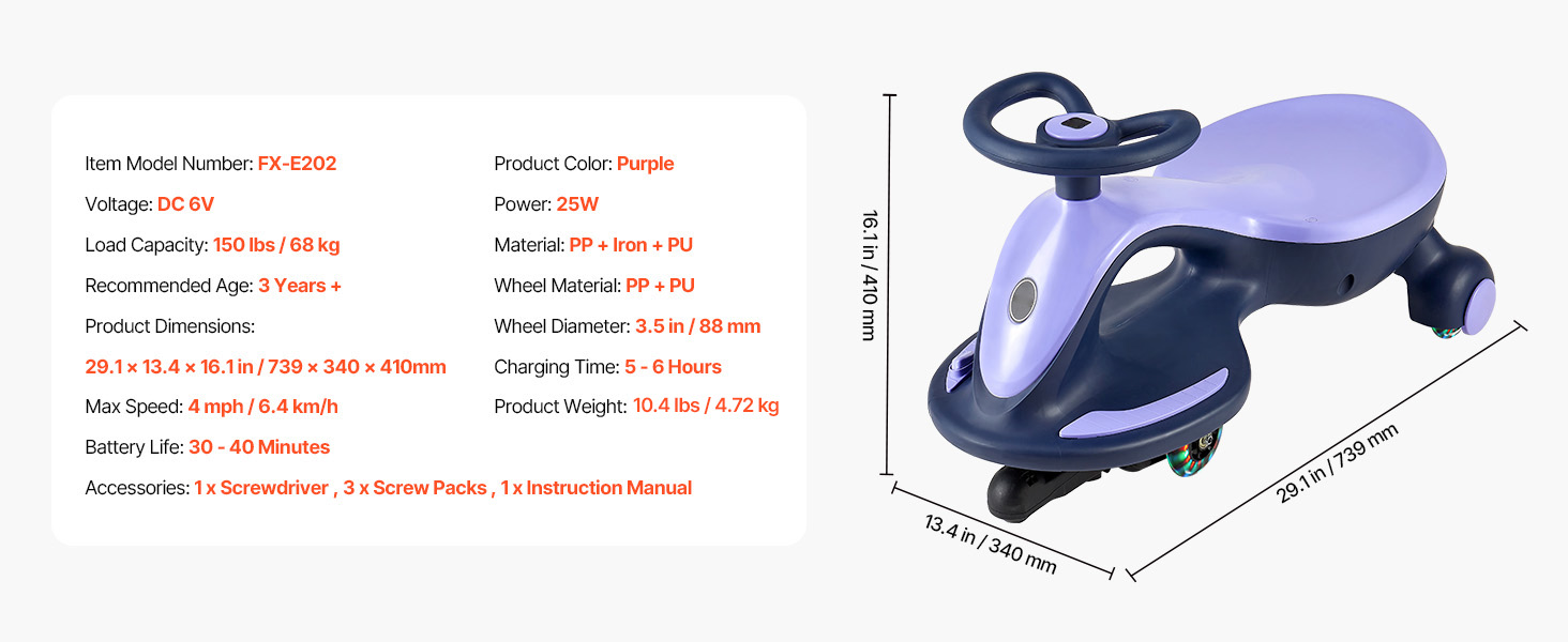 Smooth and Secure Cycling Experience on Various Terrains:The PU wheels on this electric wiggle car are designed to minimize vibrations and operate quietly, providing a smooth and safe ride across diverse surfaces, including indoor areas, outdoor roads, and playgrounds.