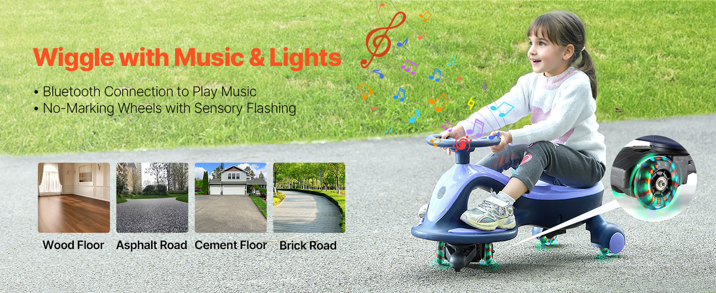 The wheels of the wiggle car flash while spinning, and you can connect via Bluetooth to play music, allowing kids to groove along with the rhythm of the lights and tunes!
