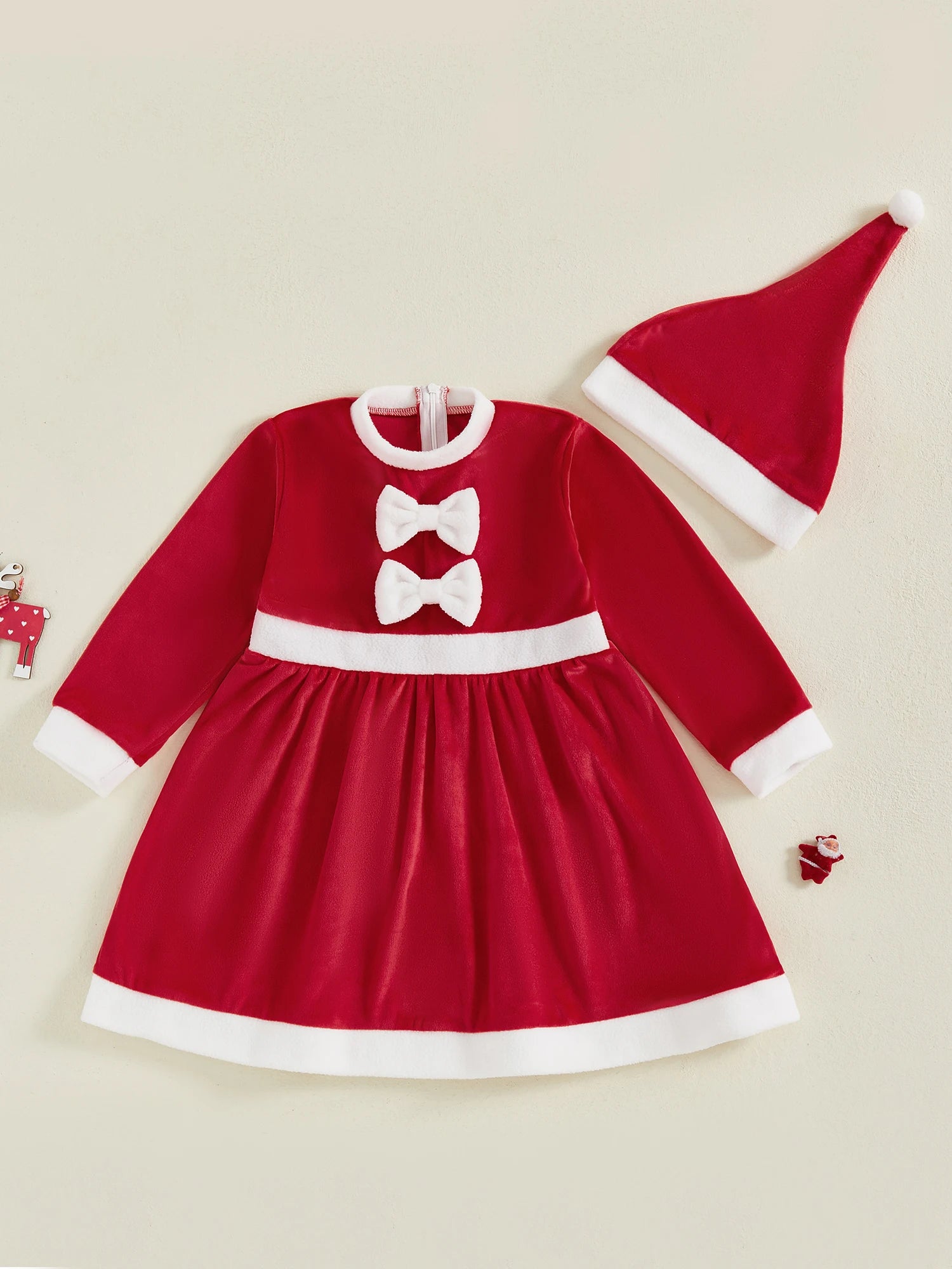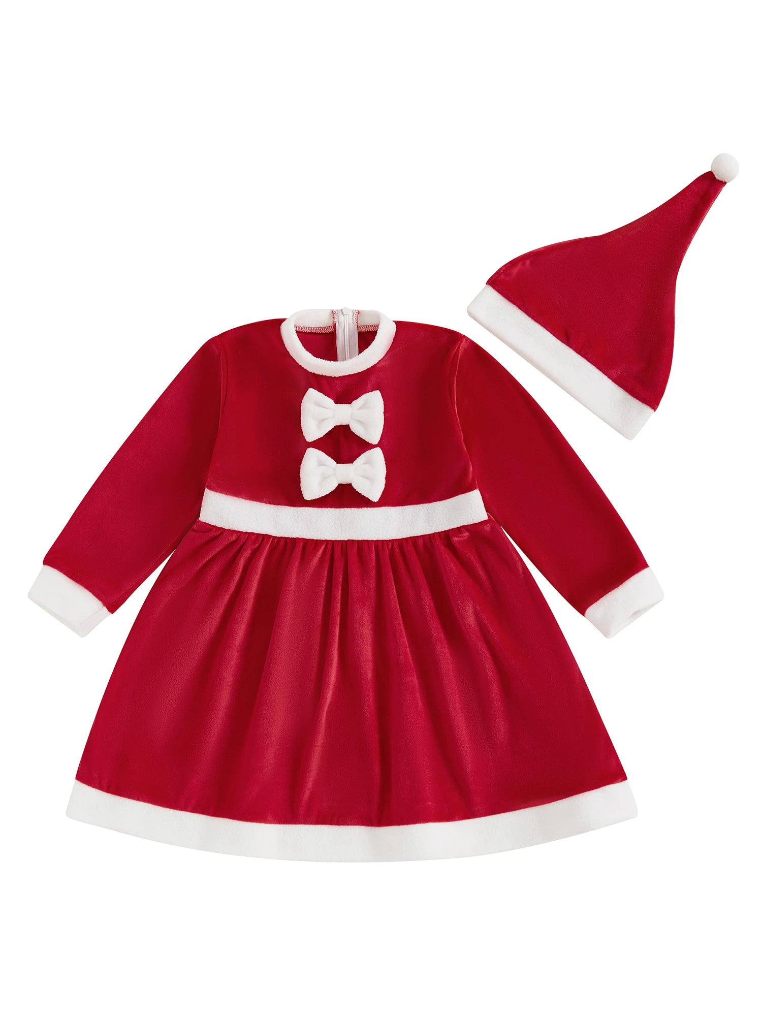 Toddler Girls Christmas Dress Fashionable Contrast Color Long Sleeve Bow Dress with Red Hat