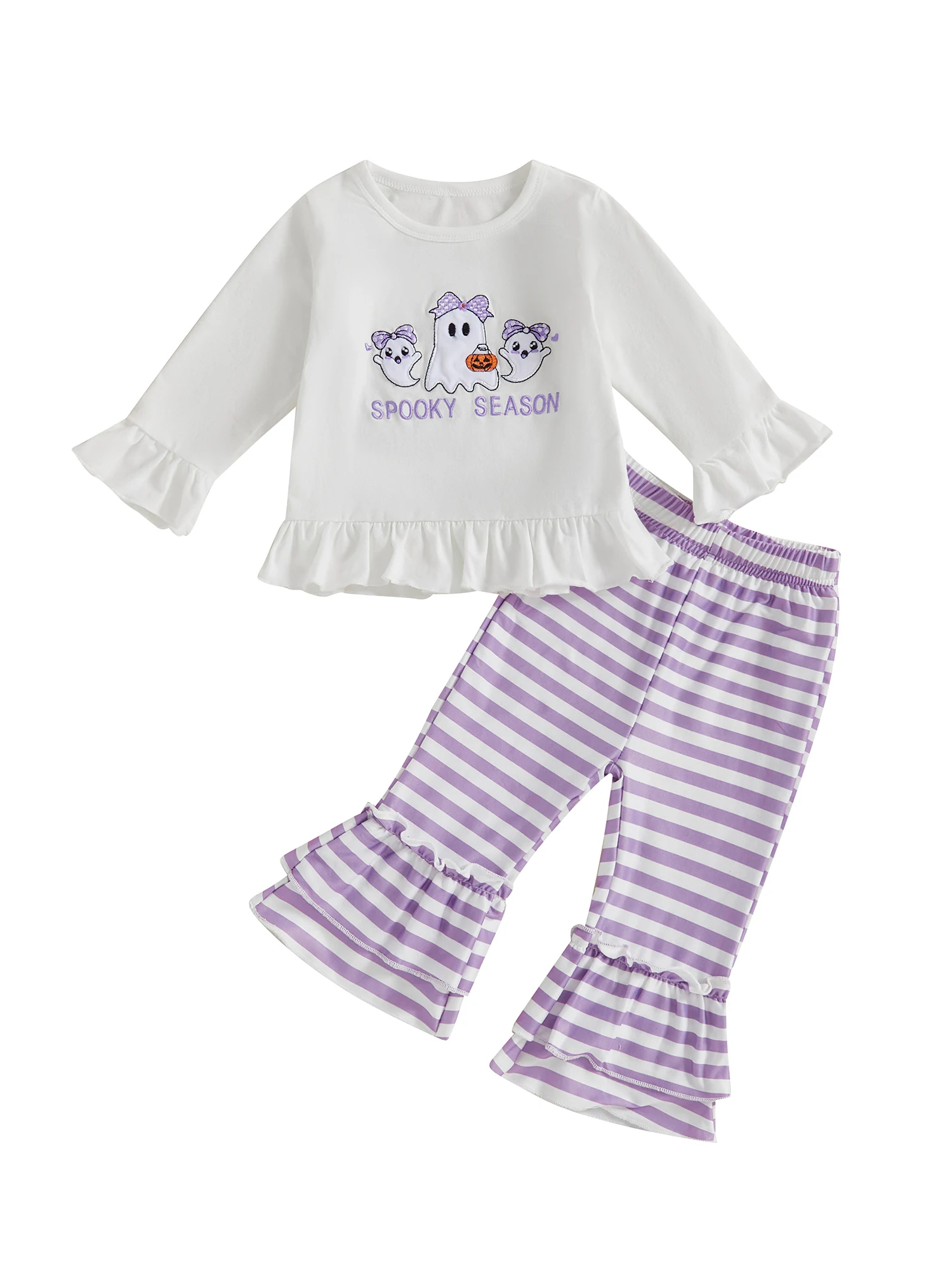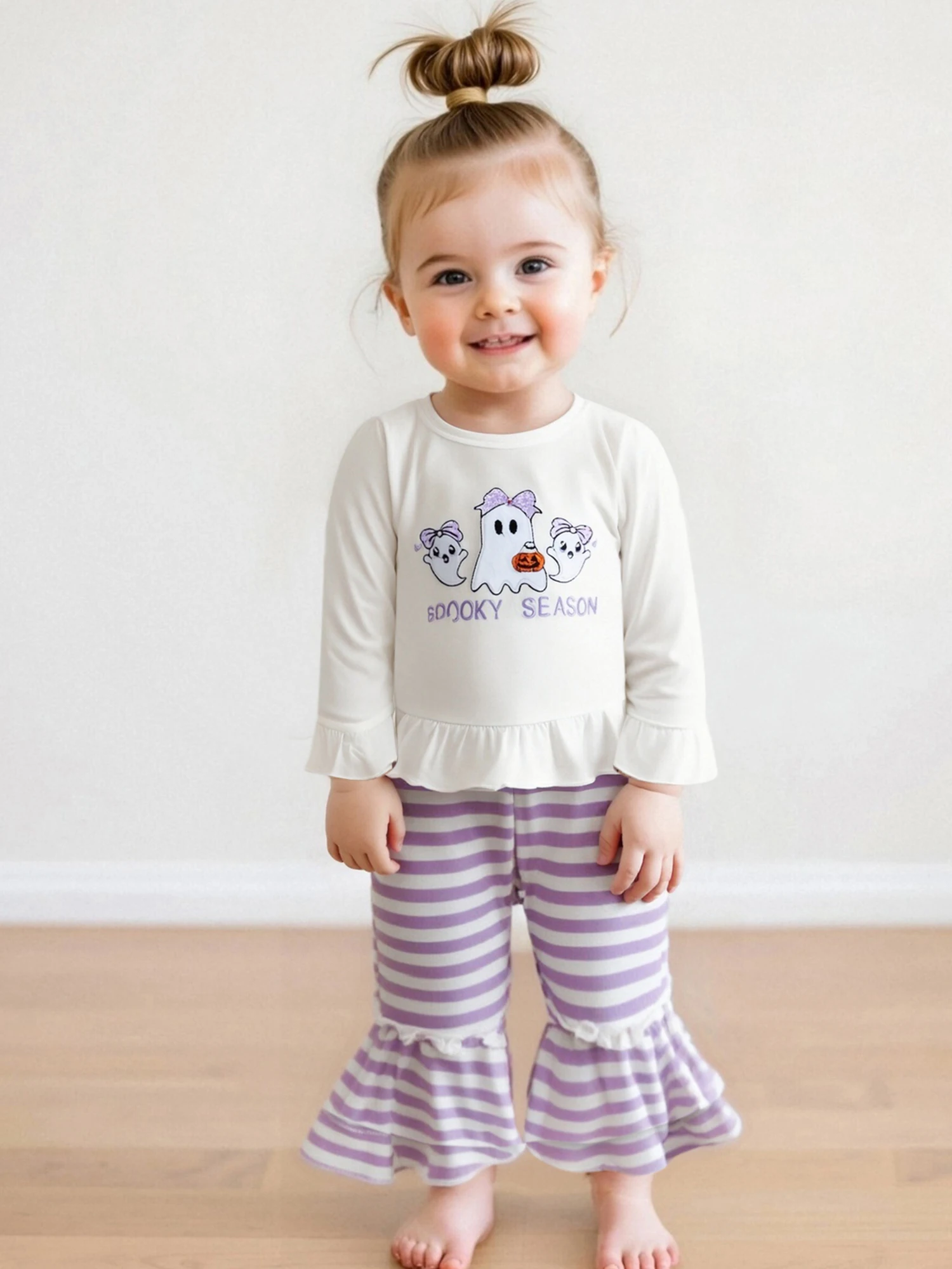 Toddler Girls Pants Set, Embroidery Grimace Ghost T-shirt with Striped Flare Pants Halloween Clothes