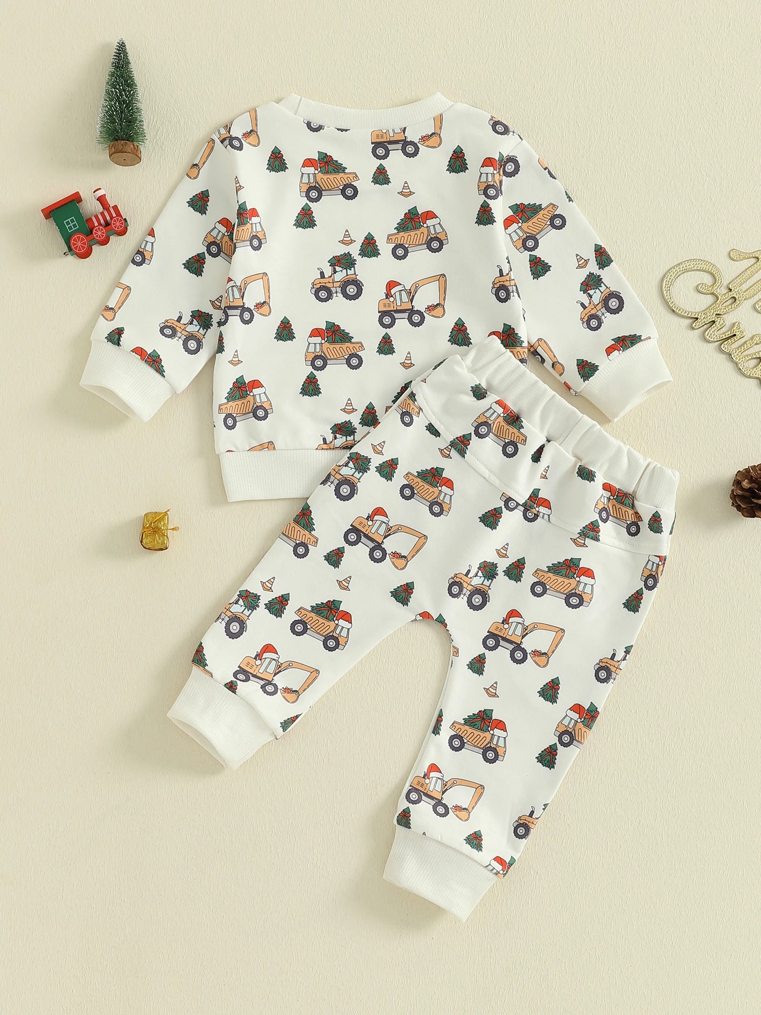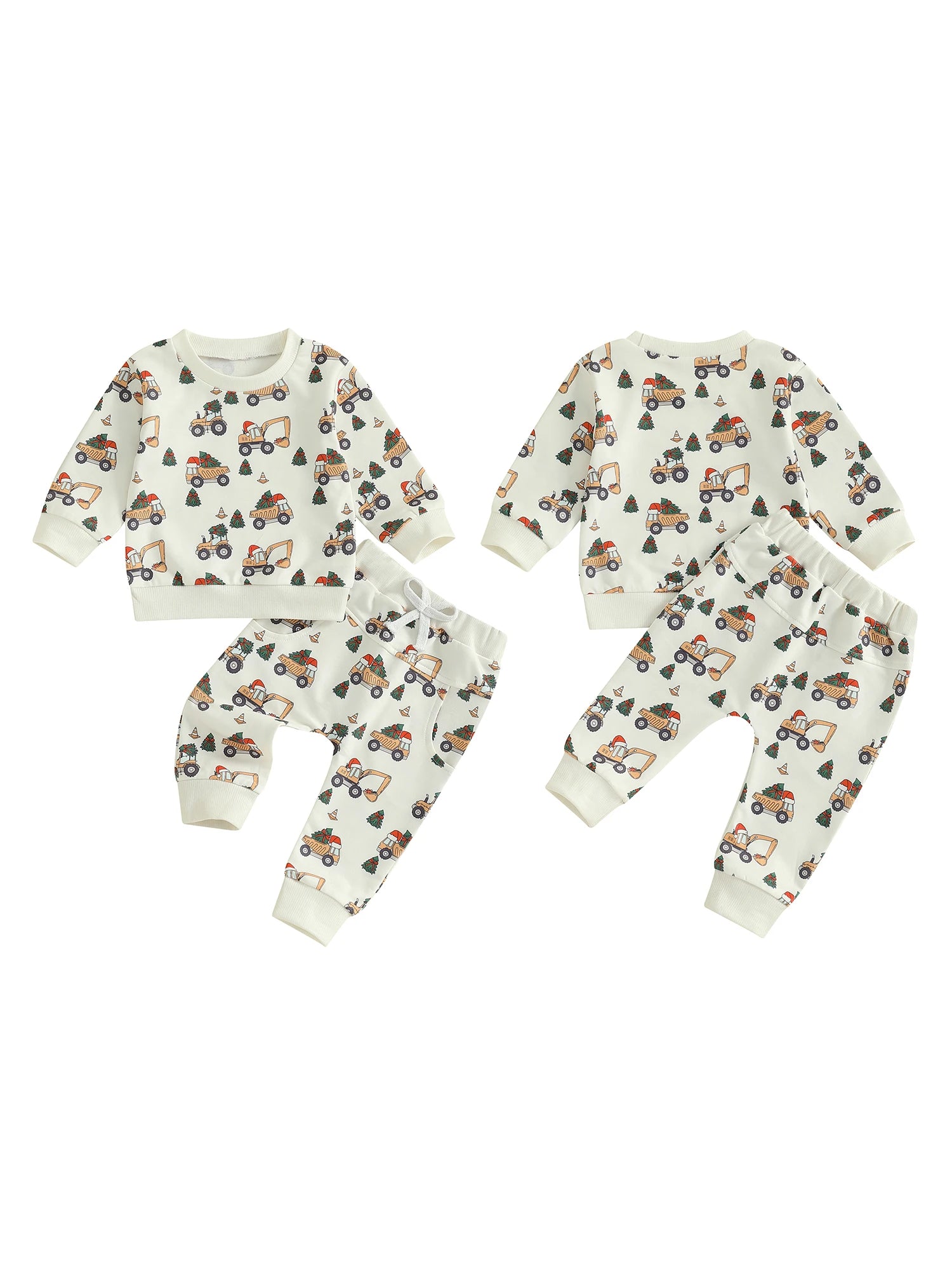 Toddler Baby Boy Christmas Outfit Truck Christmas Tree Print Long Sleeve Sweatshirt and Pants 2 Pcs Set