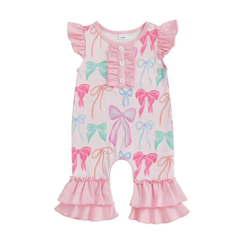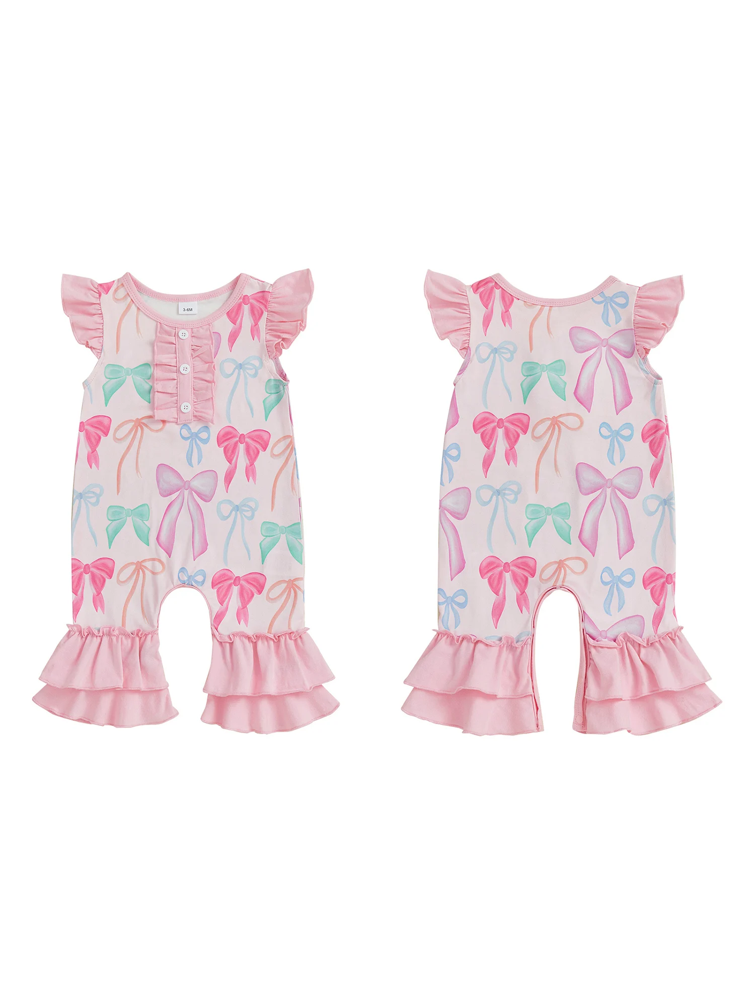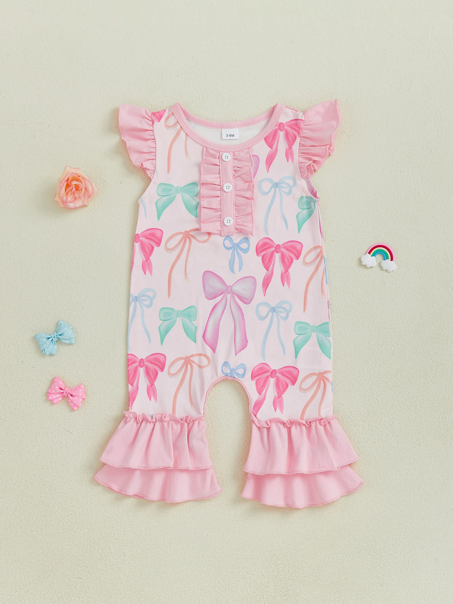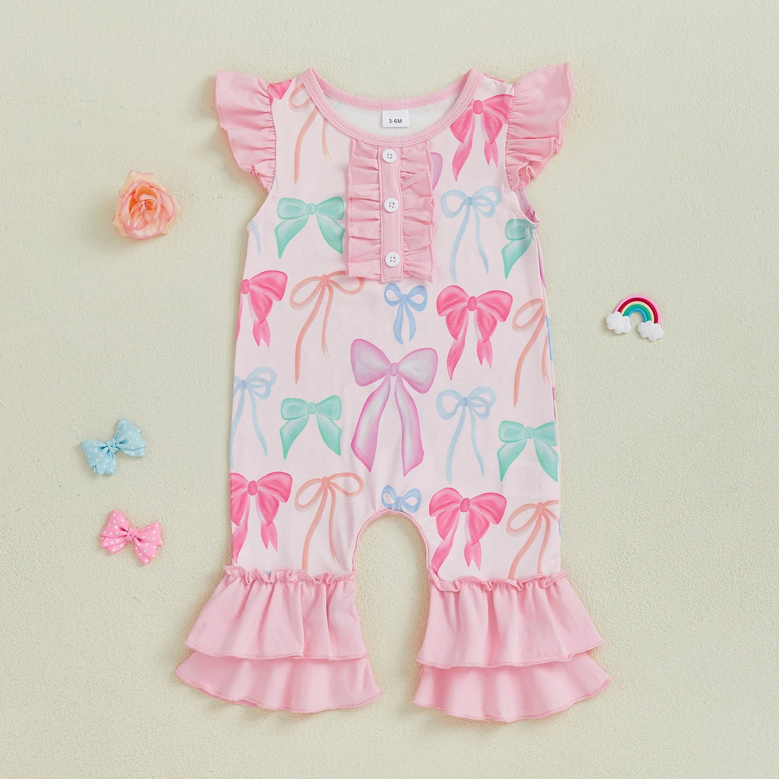 Baby Girls Jumpsuit Fly Sleeve Crew Neck Bow Print Summer Casual Romper Clothes