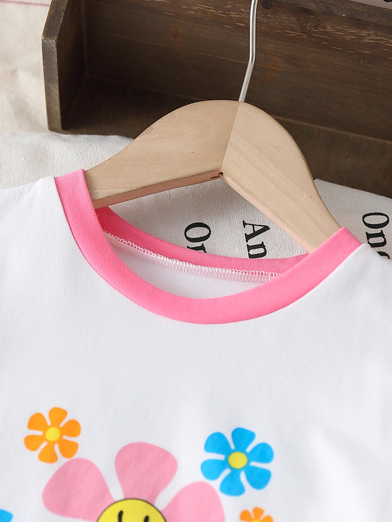 Girls Aged 4-7 Years Old Flower Smiley Face T-Shirt + Lace Bell Bottoms Set