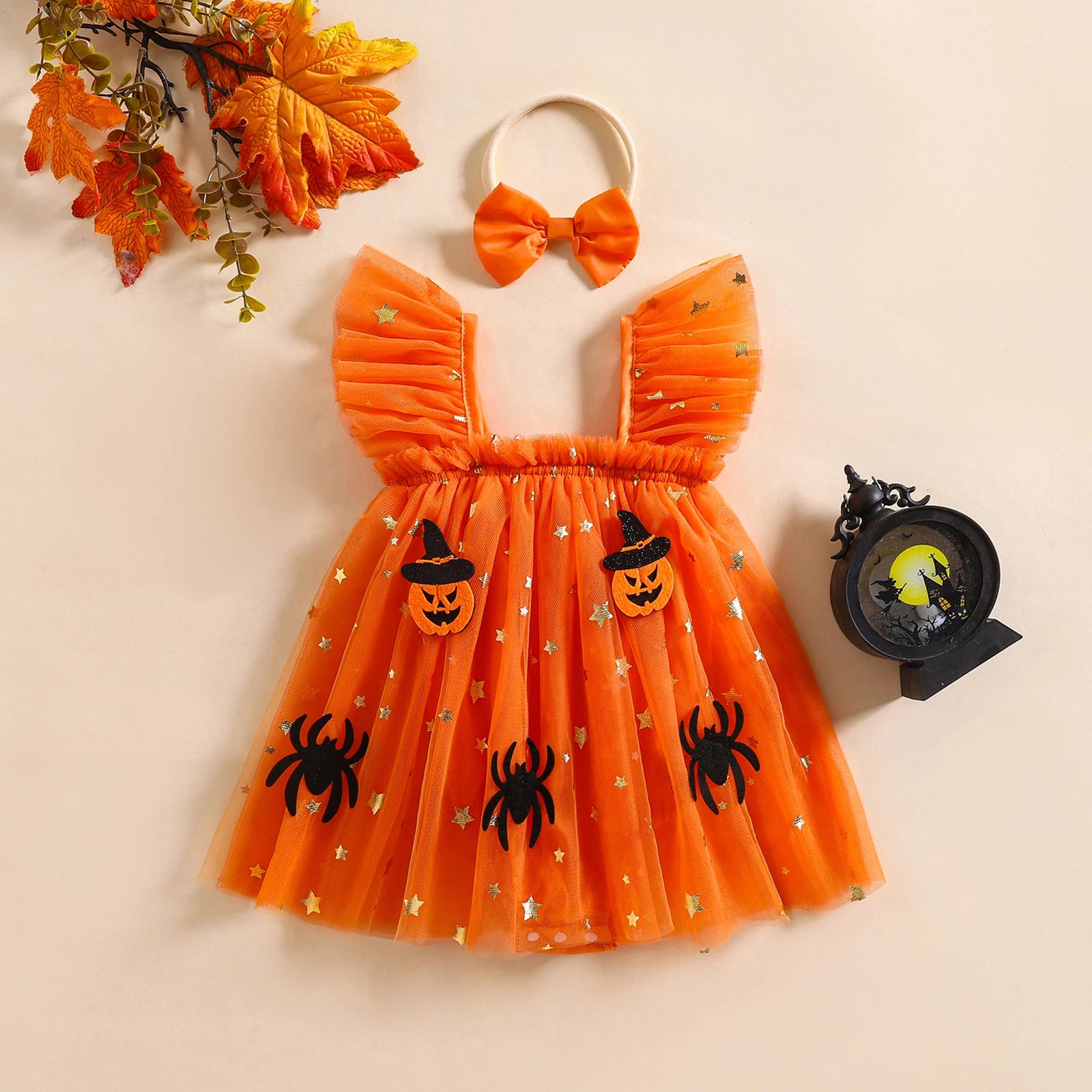 Newborn Girl Outfit, Fly Sleeve Square Neck Pumpkin Spider Bat Tulle Romper Dress with Hairband Halloween Clothes