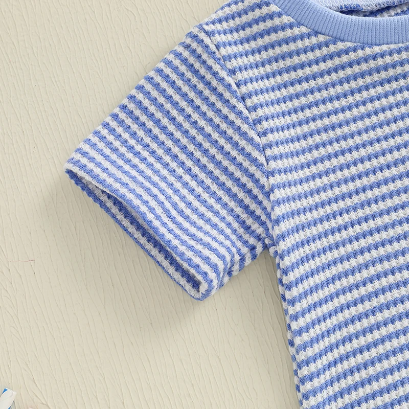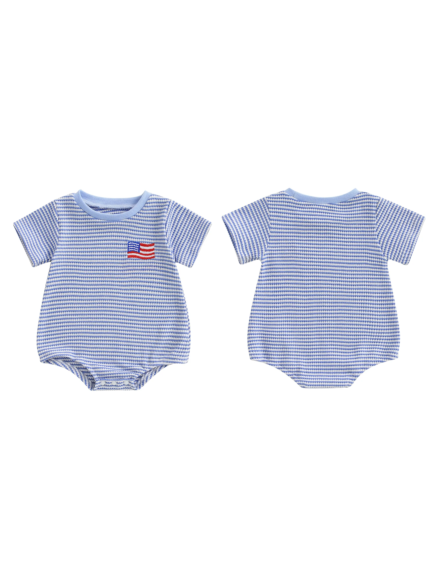 Patriotic baby clothes; Baby boy jumpsuit with flag embroidery, striped print, short sleeves, round neckline, crotch buttons, easy to put on and take off; Simple but fashionable design, make your baby more adorable