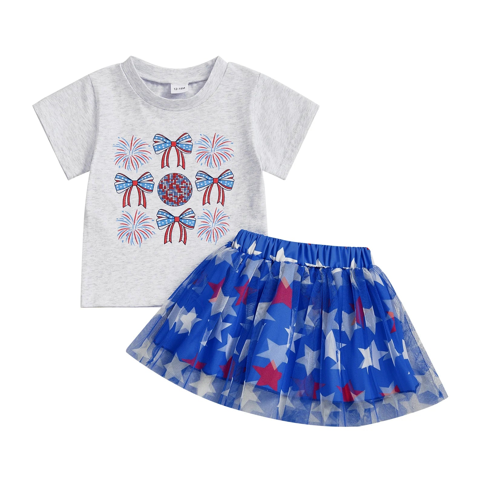 Girls 4th of July Skirt Outfits Short Sleeve Bow/Letter Print Tops A-line Tulle Skirt Set