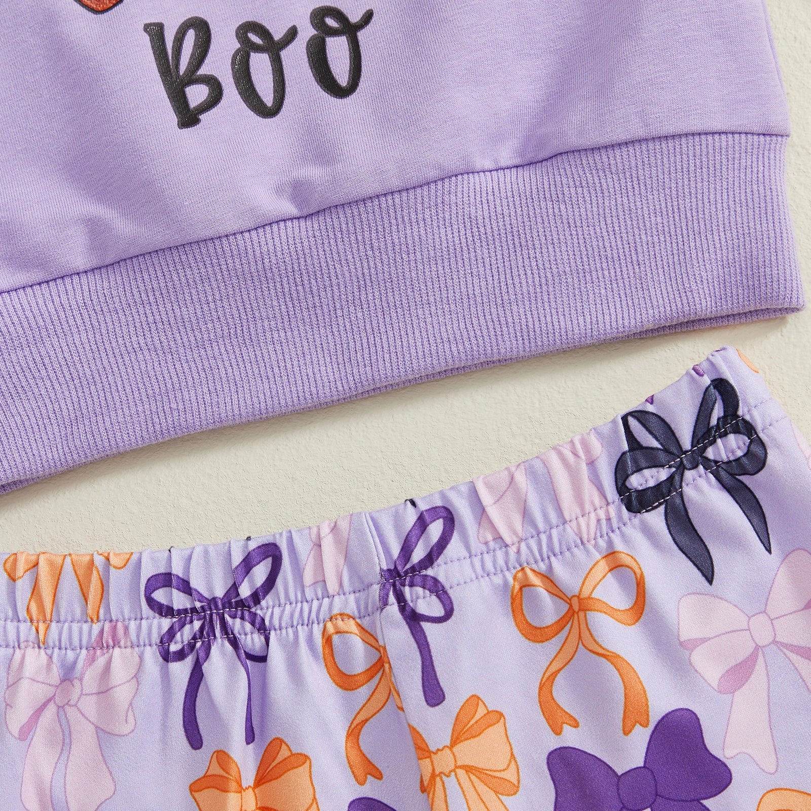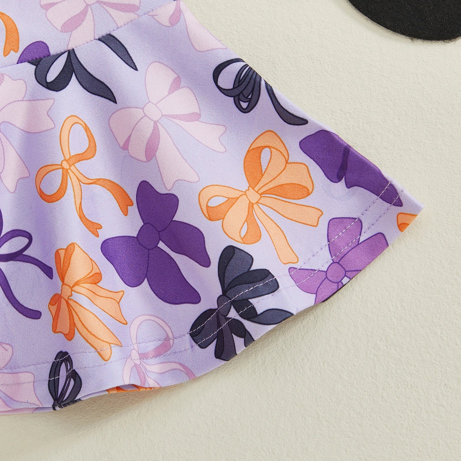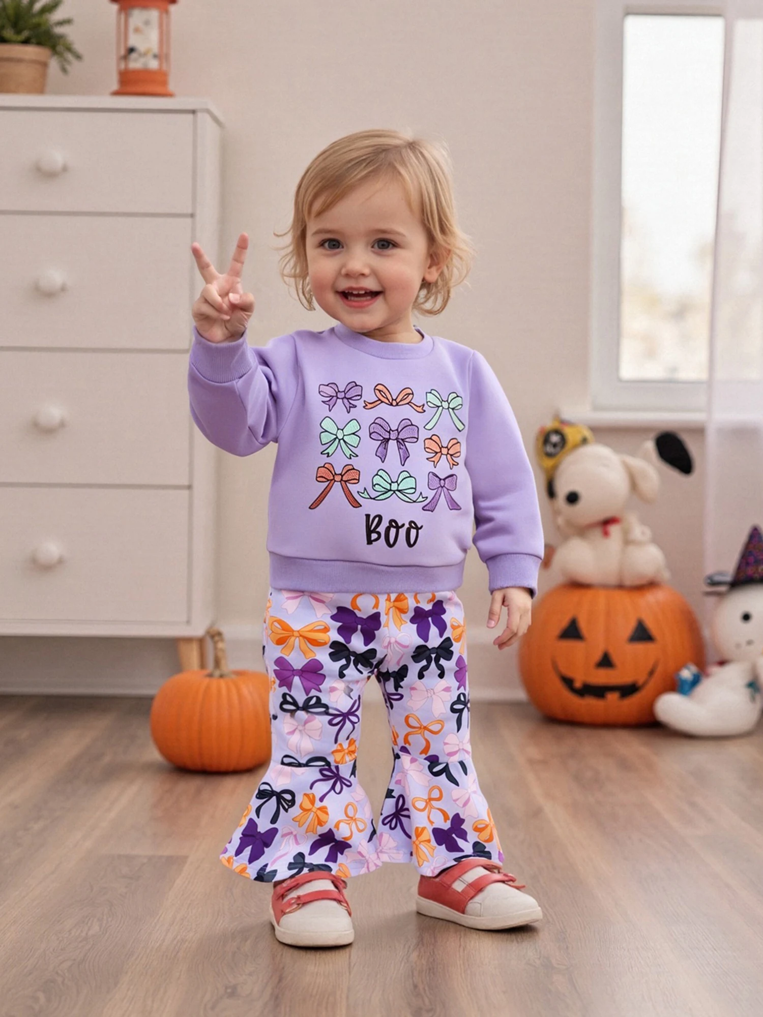 Toddler Girl Halloween Outfits Bow Print Long Sleeve Round Neck Pullover + Elastic Waist Flare Pants 2 Pcs Set