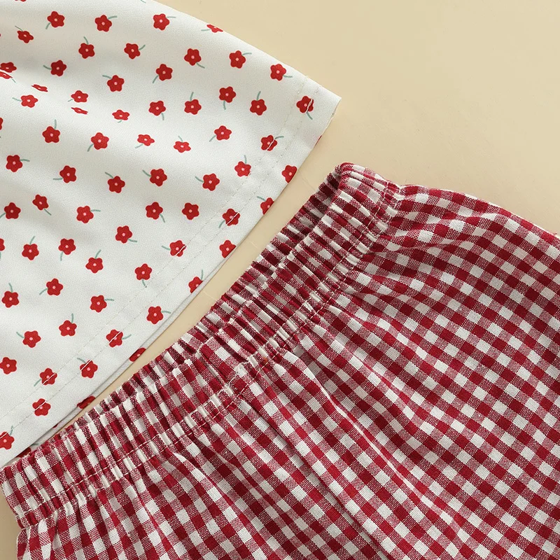 Baby Girl Summer Clothes Floral Print Tie-up Spaghetti Strap Cami Tops + Elastic Waist Plaid Shorts 2 Pcs Set