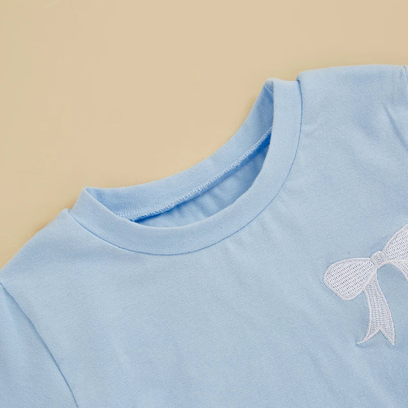 Toddler Girls 2 Piece Outfits Short Sleeve Bow Embroidery Tops and Bow Print Shorts Sets
