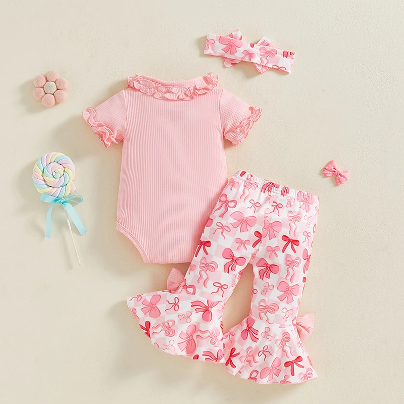 Baby Girls 3Pcs Pants Sets Short Sleeve Doll Collar Romper Bow Print Flared Pants Headband SetsSize (cm)