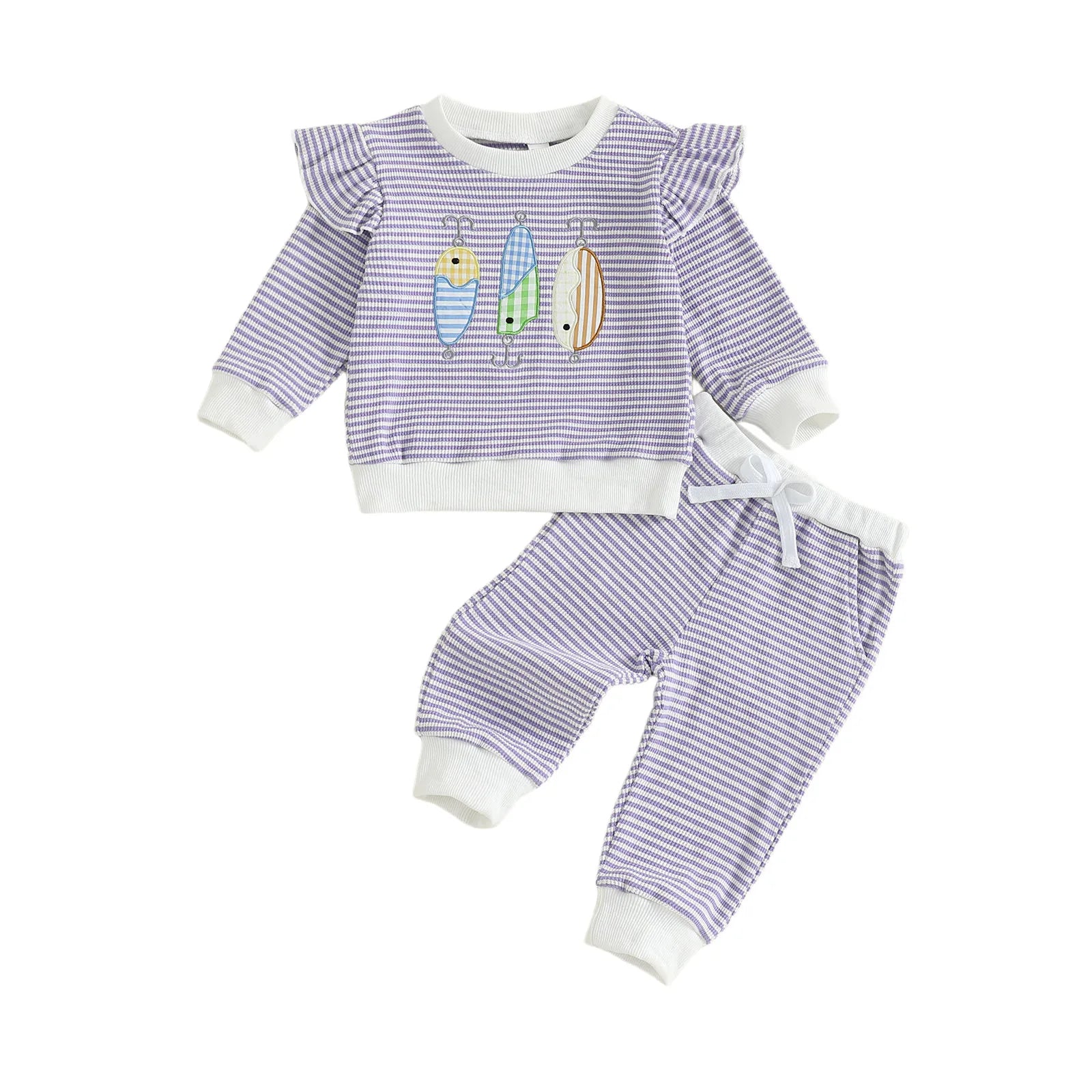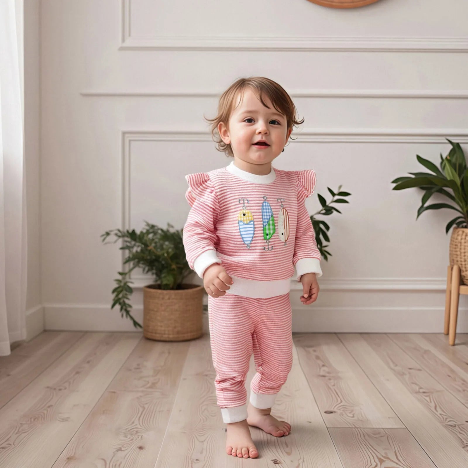 Toddler Girls Autumn Pants Sets Fish Bait Embroidery Long Sleeve Striped Tops Pants Set